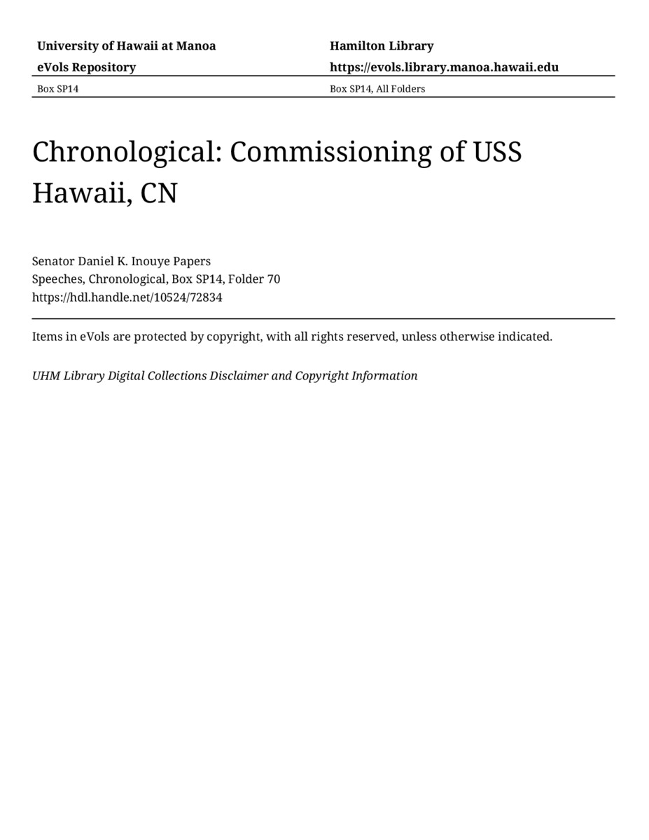 Commissioning of USS Hawaii, CN, May 5, 2007, MANUSCRIPT-HCPC00011, Speeches, Chronological, Box SP14, Folder 70, Senator Daniel K. Inouye Papers, Hawaiʻi Congressional Papers Collection, University of Hawaiʻi at Mānoa Library, Honolulu, HI. https://omekas-congress.lib.wvu.edu/catalog/10524_72834 (accessed April 17, 2026).