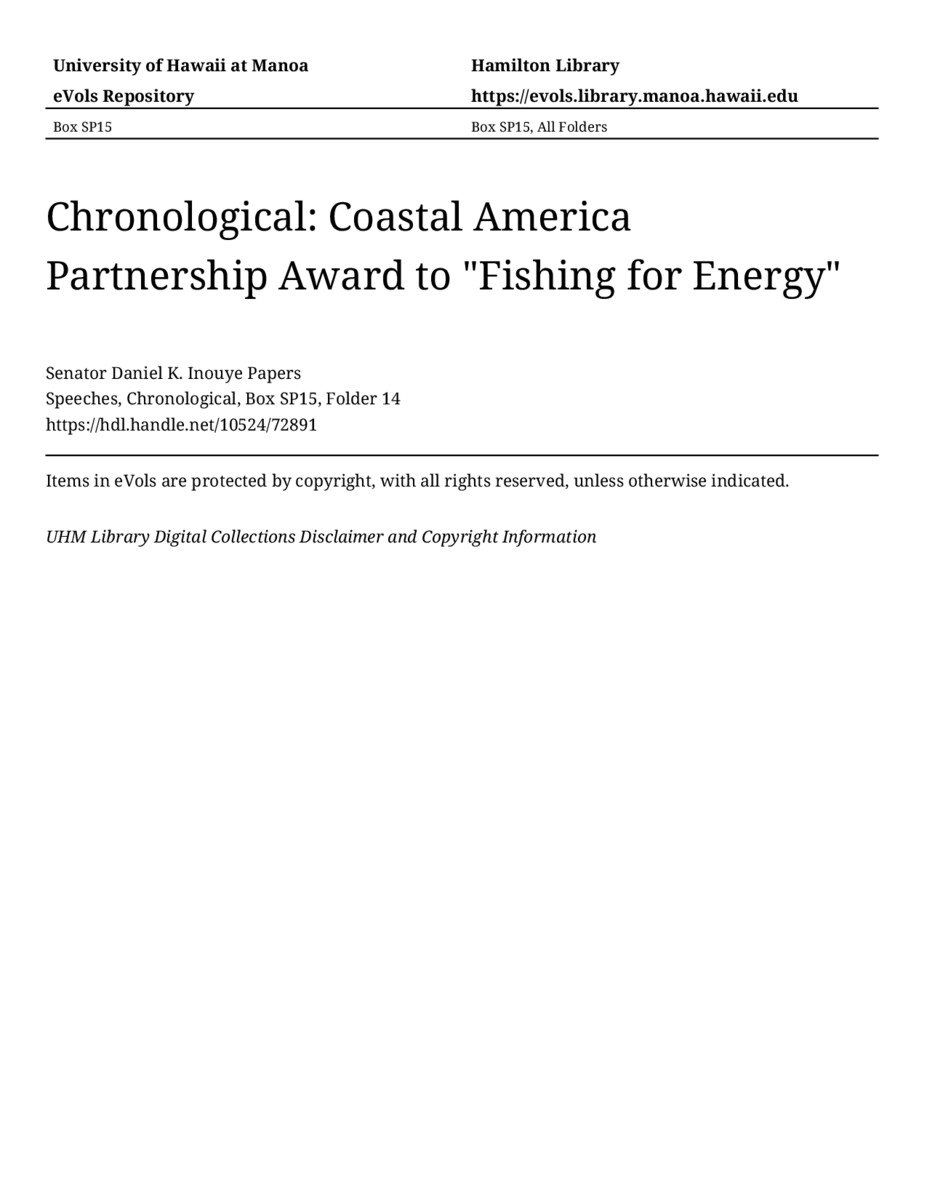 Coastal America Partnership Award to "Fishing for Energy", June 23, 2010, MANUSCRIPT-HCPC00011, Speeches, Chronological, Box SP15, Folder 14, Senator Daniel K. Inouye Papers, Hawaiʻi Congressional Papers Collection, University of Hawaiʻi at Mānoa Library, Honolulu, HI. https://omekas-congress.lib.wvu.edu/catalog/10524_72891 (accessed April 09, 2026).
