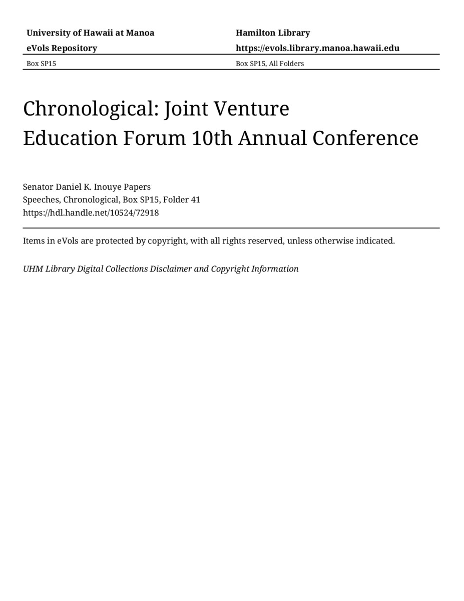 Joint Venture Education Forum 10th Annual Conference, August 25, 2011, MANUSCRIPT-HCPC00011, Speeches, Chronological, Box SP15, Folder 41, Senator Daniel K. Inouye Papers, Hawaiʻi Congressional Papers Collection, University of Hawaiʻi at Mānoa Library, Honolulu, HI. https://omekas-congress.lib.wvu.edu/catalog/10524_72918 (accessed April 20, 2026).