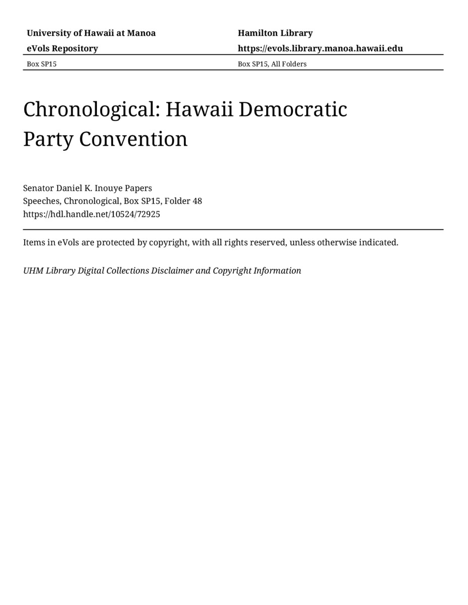 Hawaii Democratic Party Convention, May 27, 2012, MANUSCRIPT-HCPC00011, Speeches, Chronological, Box SP15, Folder 48, Senator Daniel K. Inouye Papers, Hawaiʻi Congressional Papers Collection, University of Hawaiʻi at Mānoa Library, Honolulu, HI. https://omekas-congress.lib.wvu.edu/catalog/10524_72925 (accessed April 10, 2026).
