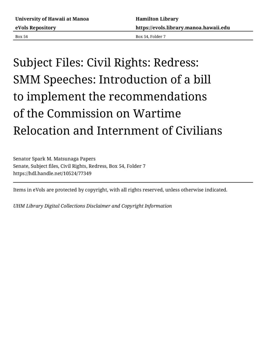 Introduction of a bill to implement the recommendations of the Commission on Wartime Relocation and Internment of Civilians, April 10, 1987, MANUSCRIPT-HCPC00001, Senate, Subject files, Civil Rights, Redress, Box 54, Folder 7, Senator Spark M. Matsunaga Papers, Hawaiʻi Congressional Papers Collection, University of Hawaiʻi at Mānoa Library, Honolulu, HI. https://omekas-congress.lib.wvu.edu/catalog/10524_77349 (accessed April 23, 2026).