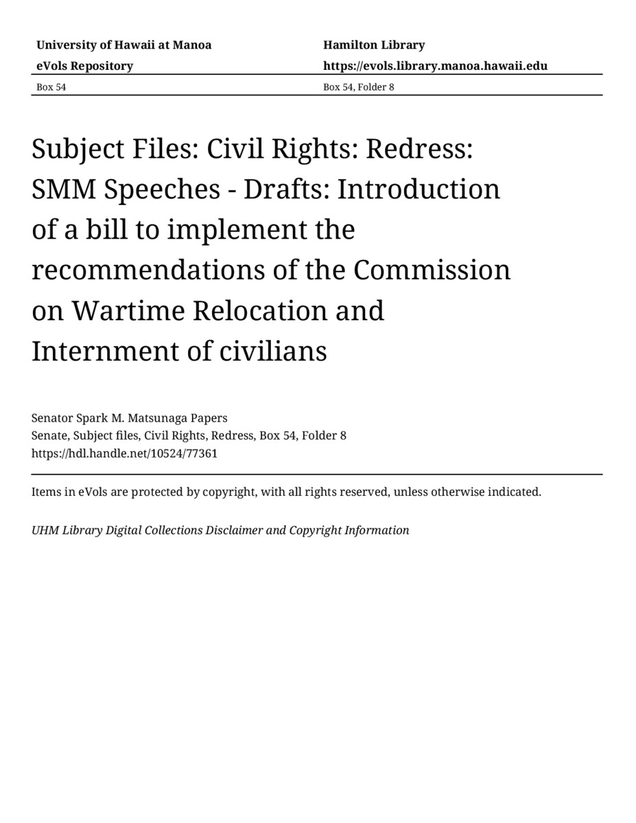 Introduction of a bill to implement the recommendations of the Commission on Wartime Relocation and Internment of civilians, April 10, 1987, MANUSCRIPT-HCPC00001, Senate, Subject files, Civil Rights, Redress, Box 54, Folder 8, Senator Spark M. Matsunaga Papers, Hawaiʻi Congressional Papers Collection, University of Hawaiʻi at Mānoa Library, Honolulu, HI. https://omekas-congress.lib.wvu.edu/catalog/10524_77361 (accessed April 23, 2026).