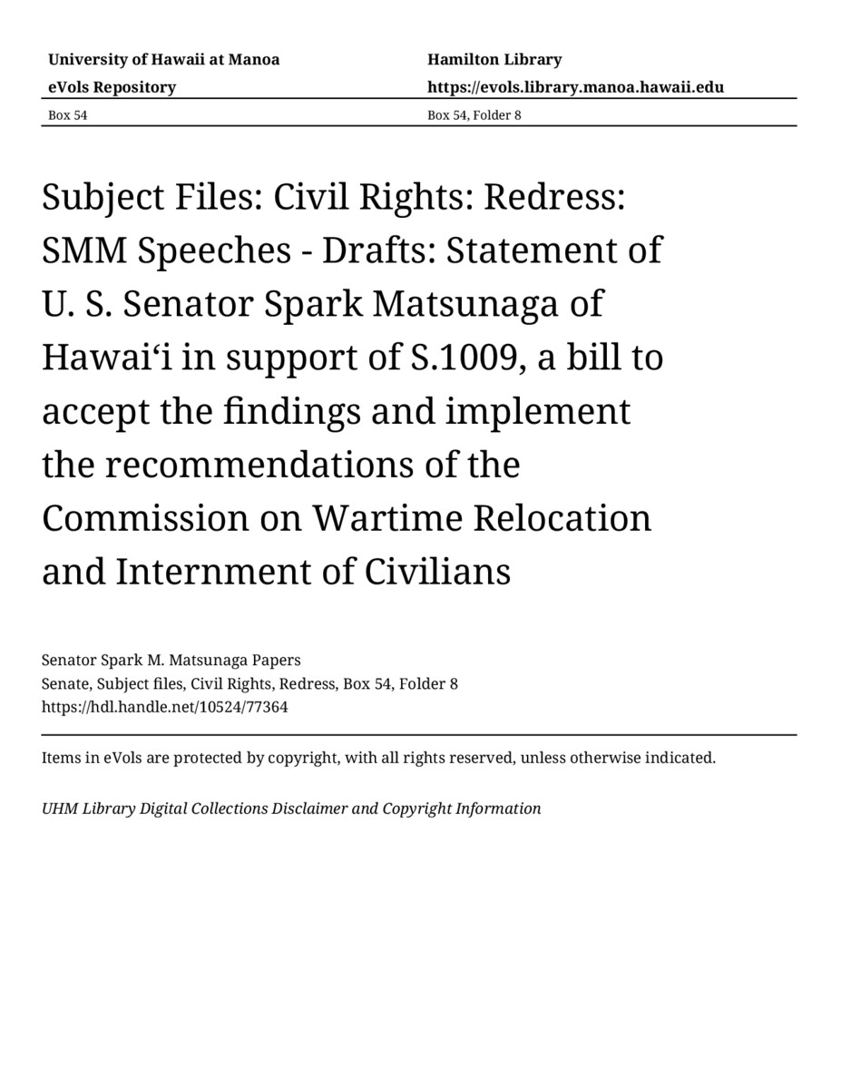 Statement of U. S. Senator Spark Matsunaga of Hawaiʻi in support of S.1009, a bill to accept the findings and implement the recommendations of the Commission on Wartime Relocation and Internment of Civilians, July 17, 1987, MANUSCRIPT-HCPC00001, Senate, Subject files, Civil Rights, Redress, Box 54, Folder 8, Senator Spark M. Matsunaga Papers, Hawaiʻi Congressional Papers Collection, University of Hawaiʻi at Mānoa Library, Honolulu, HI. https://omekas-congress.lib.wvu.edu/catalog/10524_77364 (accessed April 25, 2026).