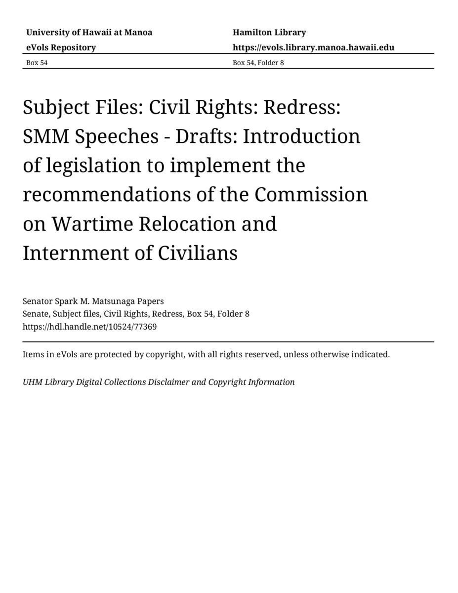Introduction of legislation to implement the recommendations of the Commission on Wartime Relocation and Internment of Civilians, November 17, 1983, MANUSCRIPT-HCPC00001, Senate, Subject files, Civil Rights, Redress, Box 54, Folder 8, Senator Spark M. Matsunaga Papers, Hawaiʻi Congressional Papers Collection, University of Hawaiʻi at Mānoa Library, Honolulu, HI. https://omekas-congress.lib.wvu.edu/catalog/10524_77369 (accessed April 18, 2026).