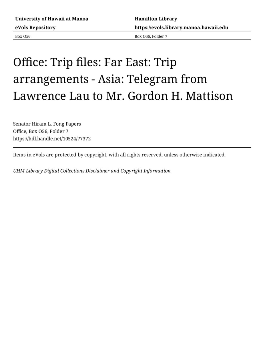 Telegram from Lawrence Lau to Mr. Gordon H. Mattison, November 2, 1959, MANUSCRIPT-HCPC00003, Office, Box O56, Folder 7, Senator Hiram L. Fong Papers, Hawaiʻi Congressional Papers Collection, University of Hawaiʻi at Mānoa Library, Honolulu, HI. https://omekas-congress.lib.wvu.edu/catalog/10524_77372 (accessed April 11, 2026).