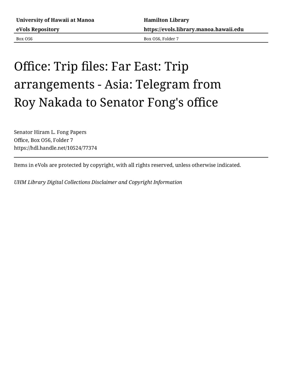 Telegram from Roy Nakada to Senator Fong's office, 1959, MANUSCRIPT-HCPC00003, Office, Box O56, Folder 7, Senator Hiram L. Fong Papers, Hawaiʻi Congressional Papers Collection, University of Hawaiʻi at Mānoa Library, Honolulu, HI. https://omekas-congress.lib.wvu.edu/catalog/10524_77374 (accessed April 11, 2026).