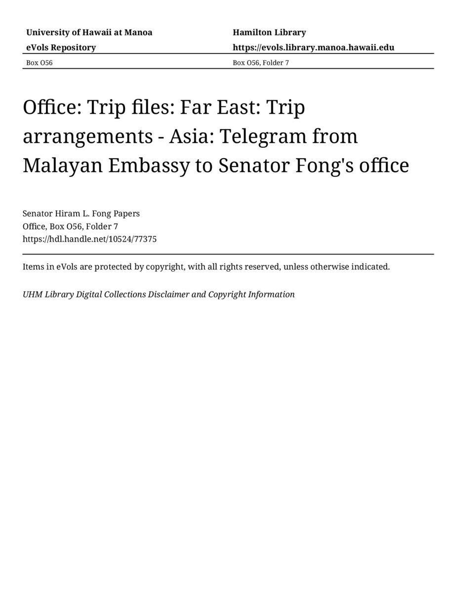 Telegram from Malayan Embassy to Senator Fong's office, October 15, 1959, MANUSCRIPT-HCPC00003, Office, Box O56, Folder 7, Senator Hiram L. Fong Papers, Hawaiʻi Congressional Papers Collection, University of Hawaiʻi at Mānoa Library, Honolulu, HI. https://omekas-congress.lib.wvu.edu/catalog/10524_77375 (accessed April 12, 2026).