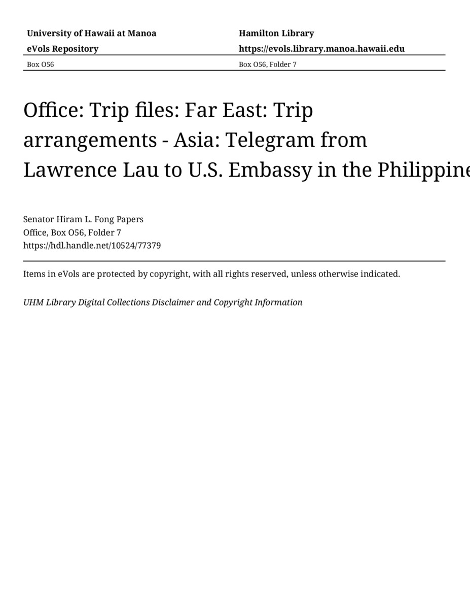 Telegram from Lawrence Lau to U.S. Embassy in the Philippines, October 9, 1959, MANUSCRIPT-HCPC00003, Office, Box O56, Folder 7, Senator Hiram L. Fong Papers, Hawaiʻi Congressional Papers Collection, University of Hawaiʻi at Mānoa Library, Honolulu, HI. https://omekas-congress.lib.wvu.edu/catalog/10524_77379 (accessed April 12, 2026).
