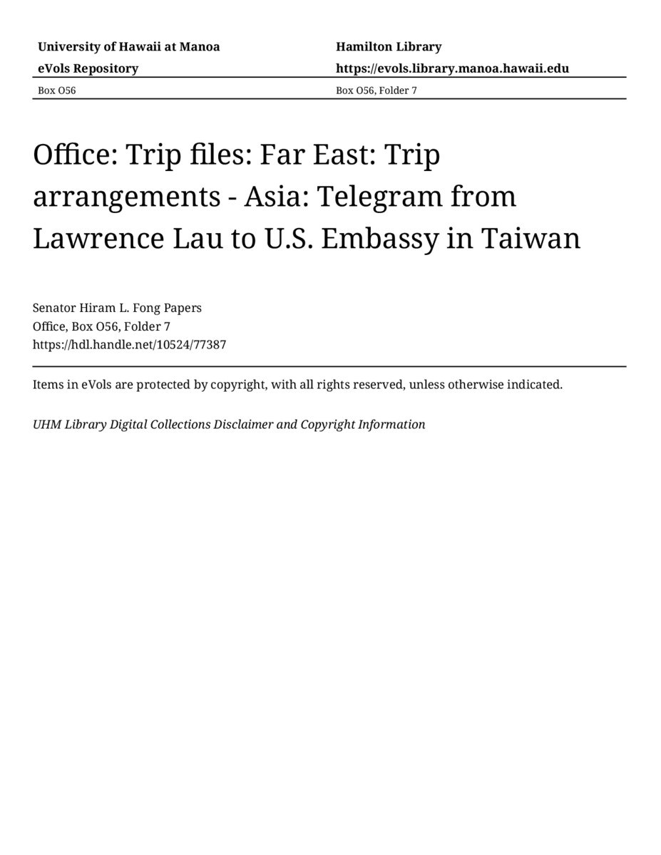 Telegram from Lawrence Lau to U.S. Embassy in Taiwan, October 9, 1959, MANUSCRIPT-HCPC00003, Office, Box O56, Folder 7, Senator Hiram L. Fong Papers, Hawaiʻi Congressional Papers Collection, University of Hawaiʻi at Mānoa Library, Honolulu, HI. https://omekas-congress.lib.wvu.edu/catalog/10524_77387 (accessed April 12, 2026).