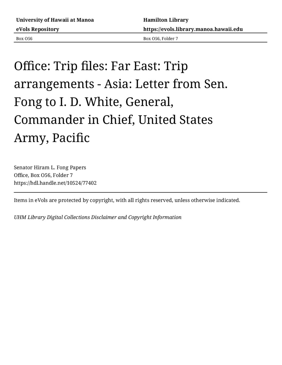 - Letter from Sen. Fong to I. D. White, General, Commander in Chief, United States Army, Pacific