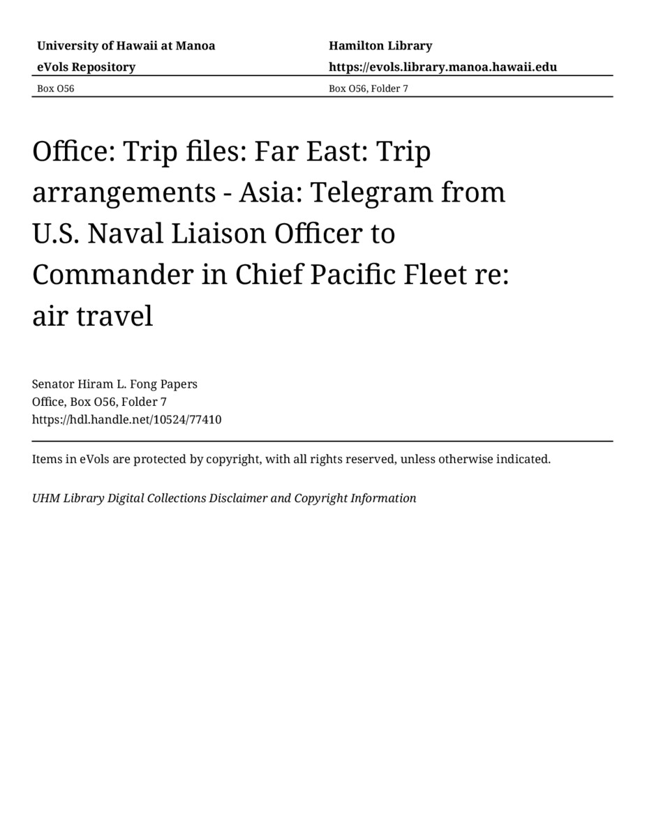- Telegram from U.S. Naval Liaison Officer to Commander in Chief Pacific Fleet re: air travel