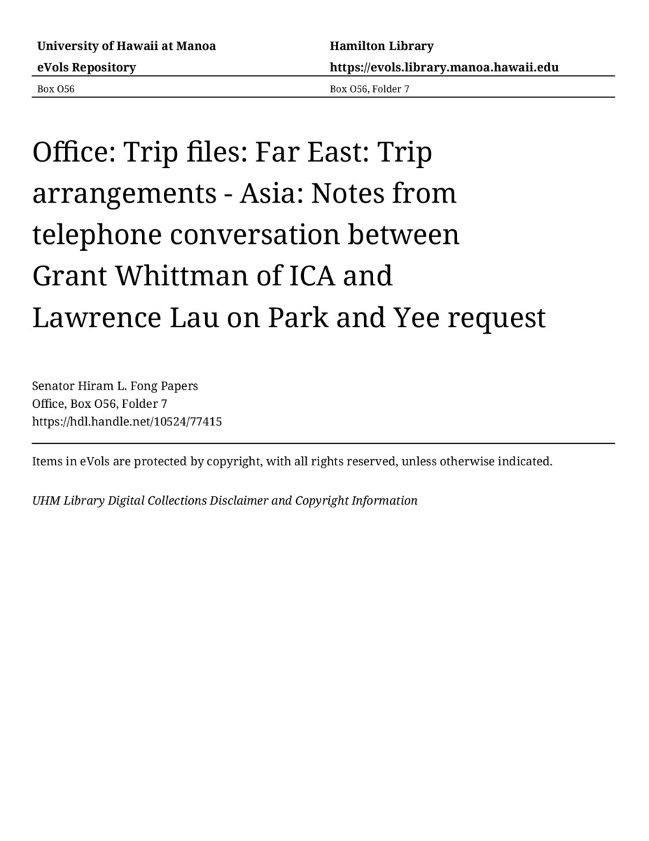 - Notes from telephone conversation between Grant Whittman of ICA and Lawrence Lau on Park and Yee request