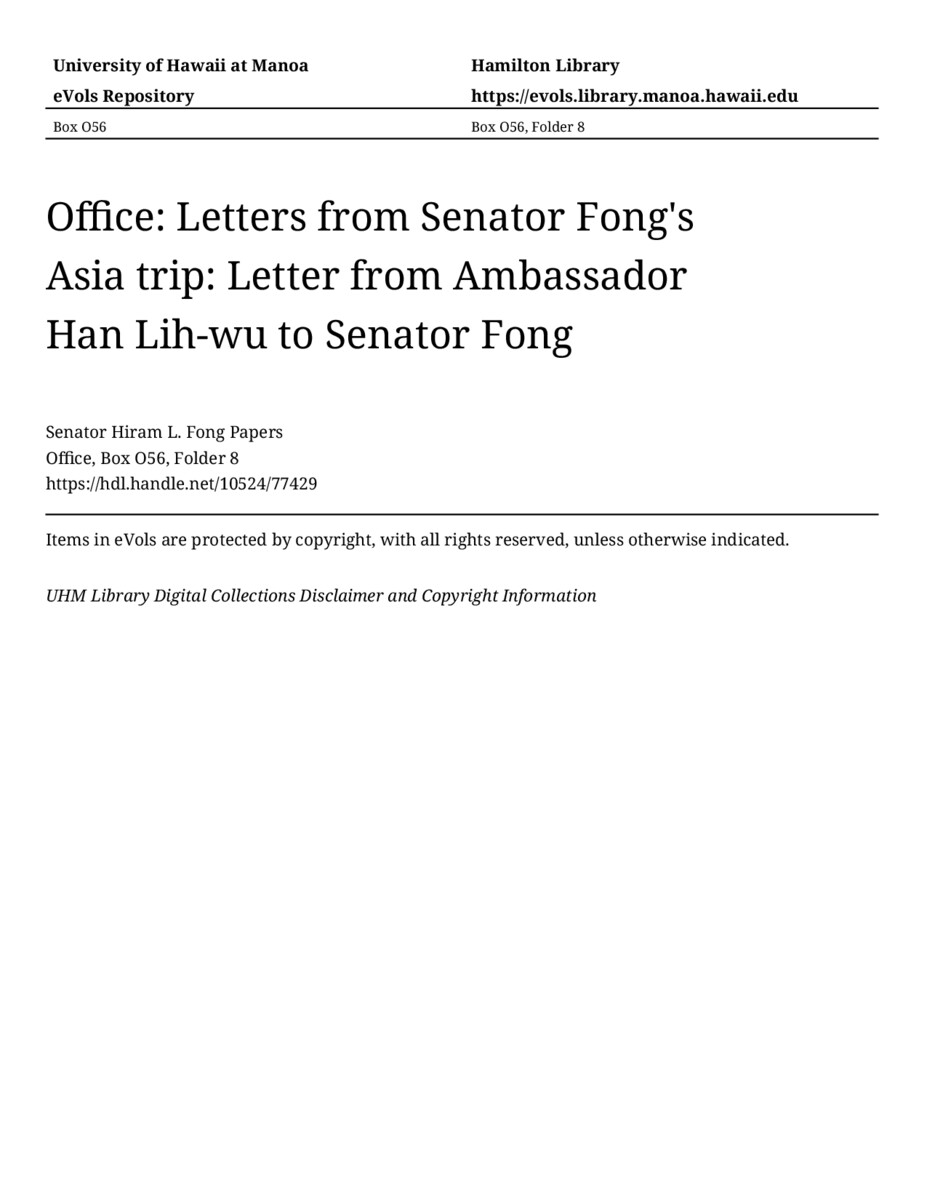 Letter from Ambassador Han Lih-wu to Senator Fong, November 12, 1959, MANUSCRIPT-HCPC00003, Office, Box O56, Folder 8, Senator Hiram L. Fong Papers, Hawaiʻi Congressional Papers Collection, University of Hawaiʻi at Mānoa Library, Honolulu, HI. https://omekas-congress.lib.wvu.edu/catalog/10524_77429 (accessed April 14, 2026).