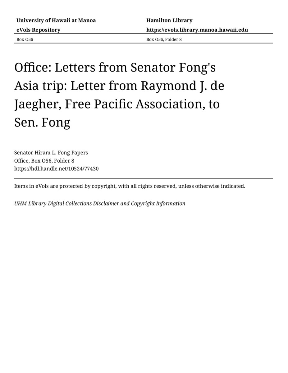 - Letter from Raymond J. de Jaegher, Free Pacific Association, to Sen. Fong