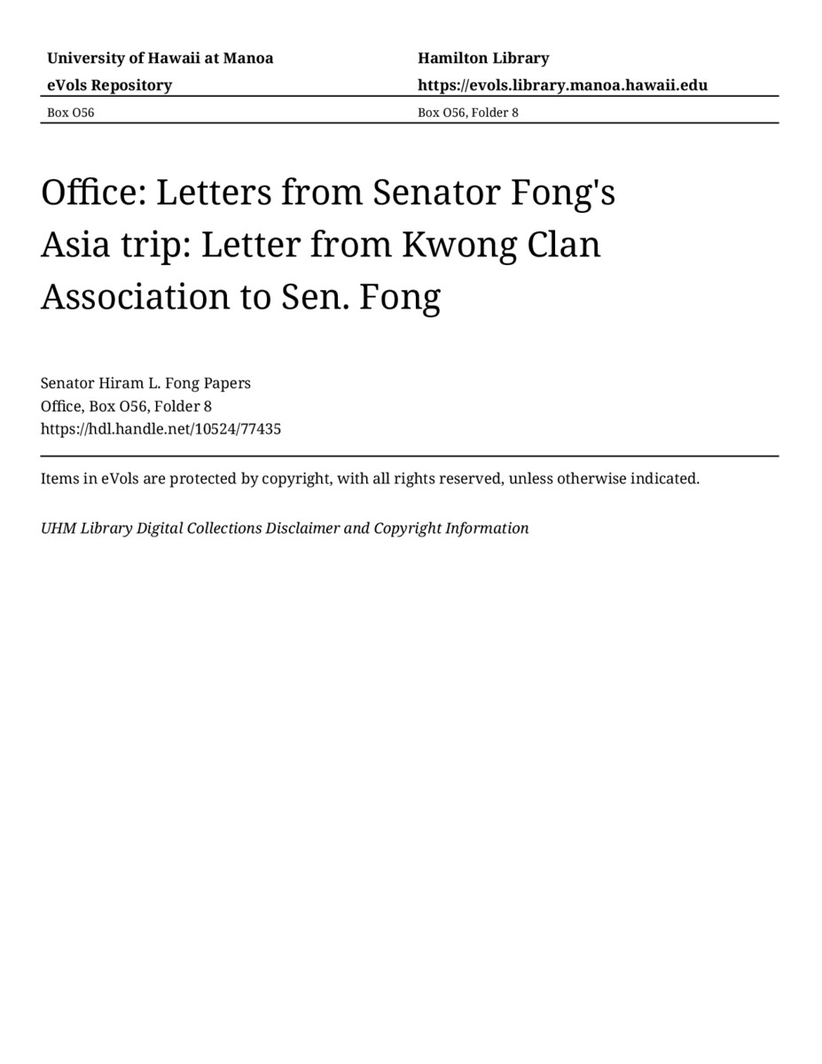 Letter from Kwong Clan Association to Sen. Fong, October 25, 1959, MANUSCRIPT-HCPC00003, Office, Box O56, Folder 8, Senator Hiram L. Fong Papers, Hawaiʻi Congressional Papers Collection, University of Hawaiʻi at Mānoa Library, Honolulu, HI. https://omekas-congress.lib.wvu.edu/catalog/10524_77435 (accessed April 20, 2026).