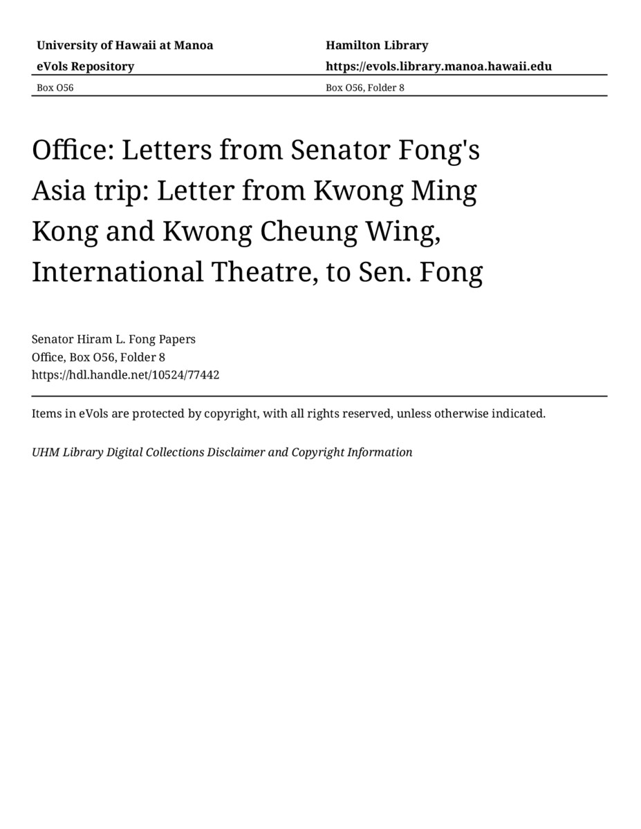 - Letter from Kwong Ming Kong and Kwong Cheung Wing, International Theatre, to Sen. Fong