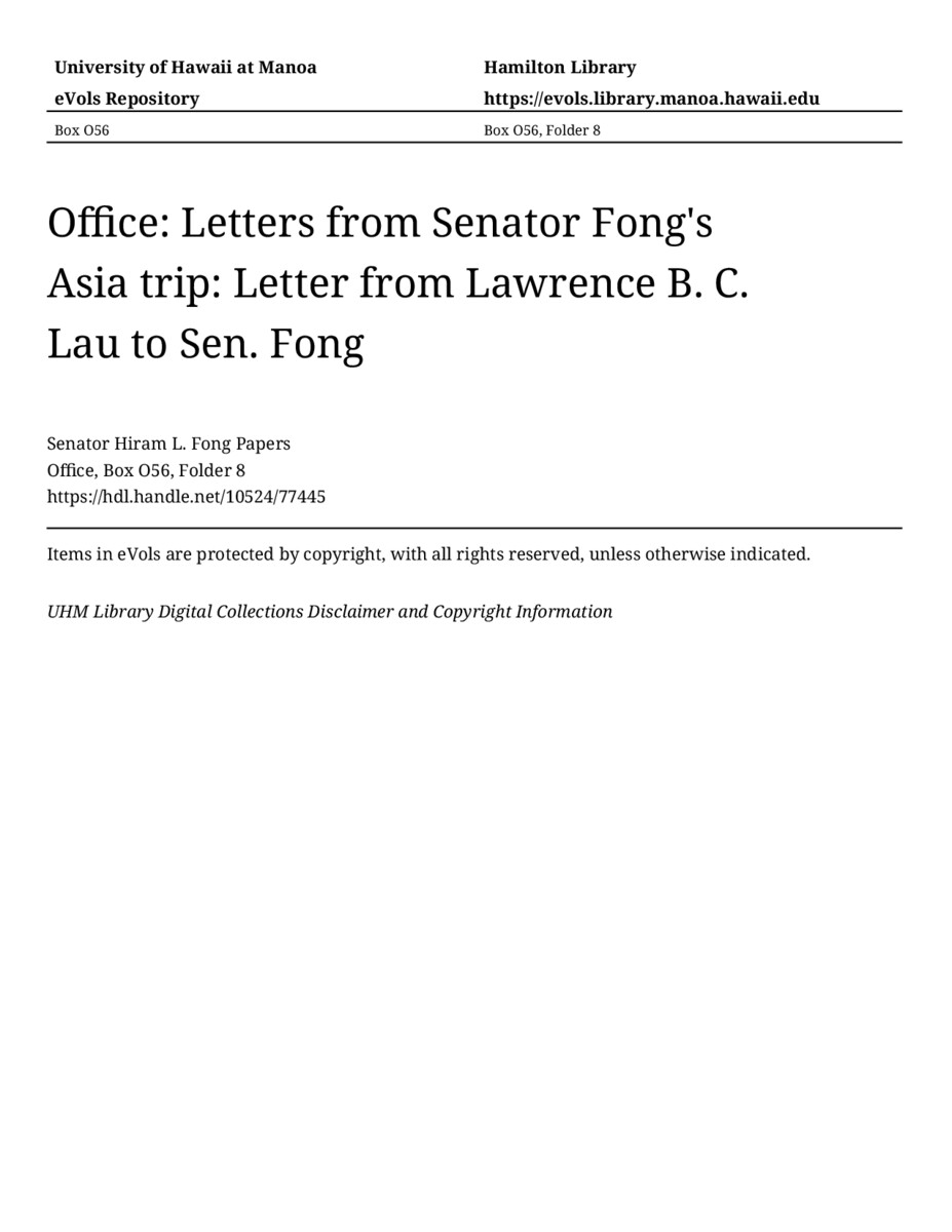 - Letter from Lawrence B. C. Lau to Sen. Fong