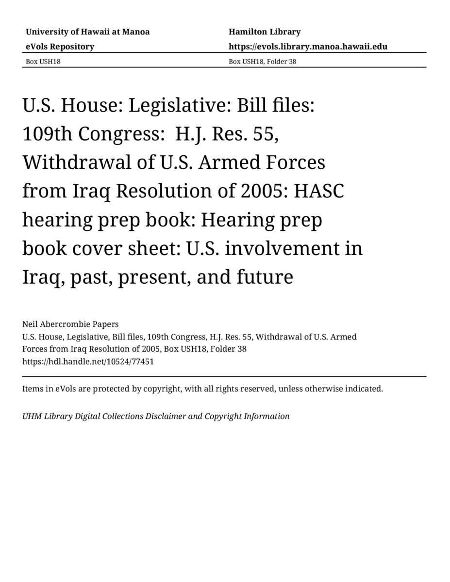 Hearing prep book cover sheet: U.S. involvement in Iraq, past, present, and future, April 6, 2005, MANUSCRIPT-HCPC00009, U.S. House, Legislative, Bill files, 109th Congress, H.J. Res. 55, Withdrawal of U.S. Armed Forces from Iraq Resolution of 2005, Box USH18, Folder 38, Neil Abercrombie Papers, Hawaiʻi Congressional Papers Collection, University of Hawaiʻi at Mānoa Library, Honolulu, HI. https://omekas-congress.lib.wvu.edu/catalog/10524_77451 (accessed April 11, 2026).