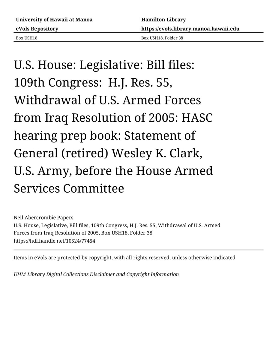 Statement of General (retired) Wesley K. Clark, U.S. Army, before the House Armed Services Committee, September 26, 2002, MANUSCRIPT-HCPC00009, U.S. House, Legislative, Bill files, 109th Congress, H.J. Res. 55, Withdrawal of U.S. Armed Forces from Iraq Resolution of 2005, Box USH18, Folder 38, Neil Abercrombie Papers, Hawaiʻi Congressional Papers Collection, University of Hawaiʻi at Mānoa Library, Honolulu, HI. https://omekas-congress.lib.wvu.edu/catalog/10524_77454 (accessed April 10, 2026).