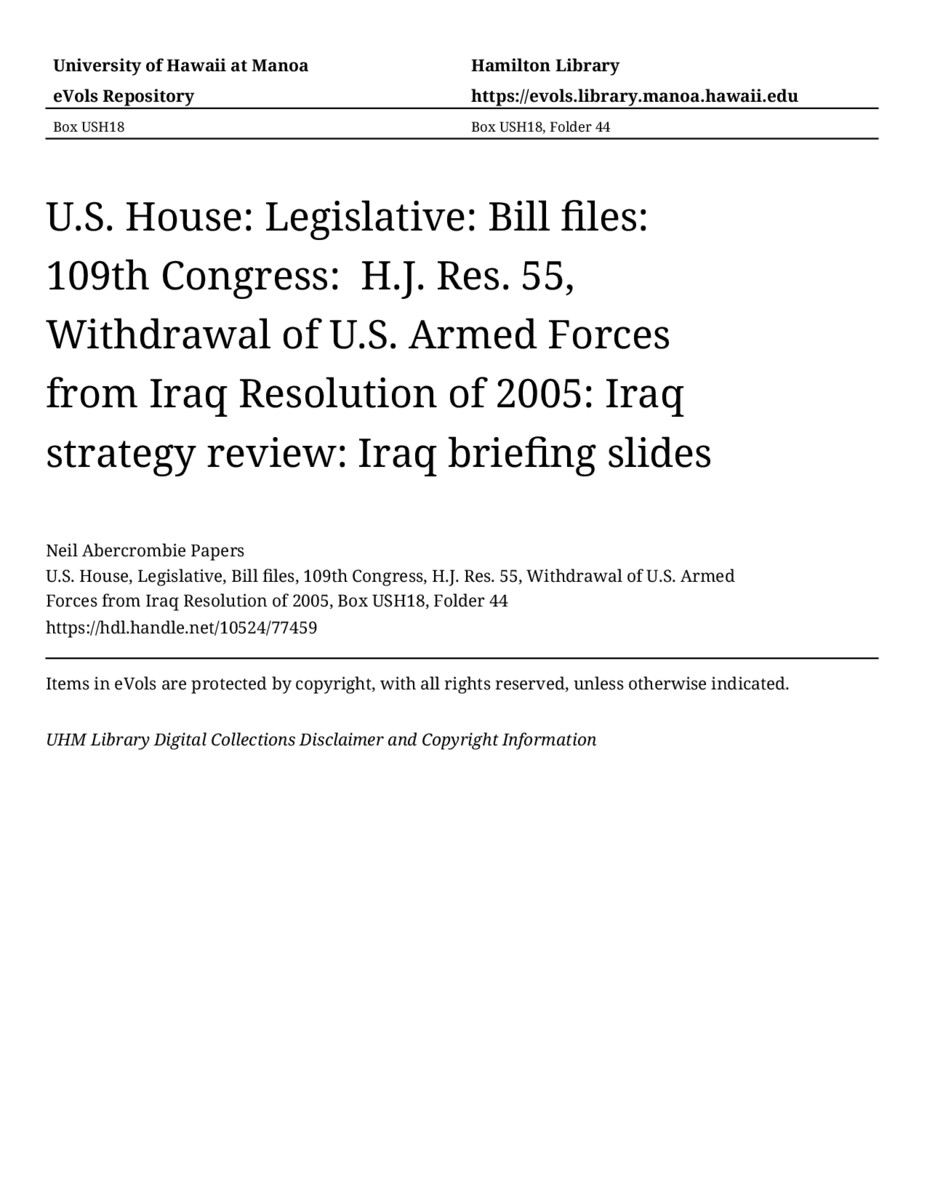 - MANUSCRIPT-HCPC00009, U.S. House, Legislative, Bill files, 109th Congress, H.J. Res. 55, Withdrawal of U.S. Armed Forces from Iraq Resolution of 2005, Box USH18, Folder 44