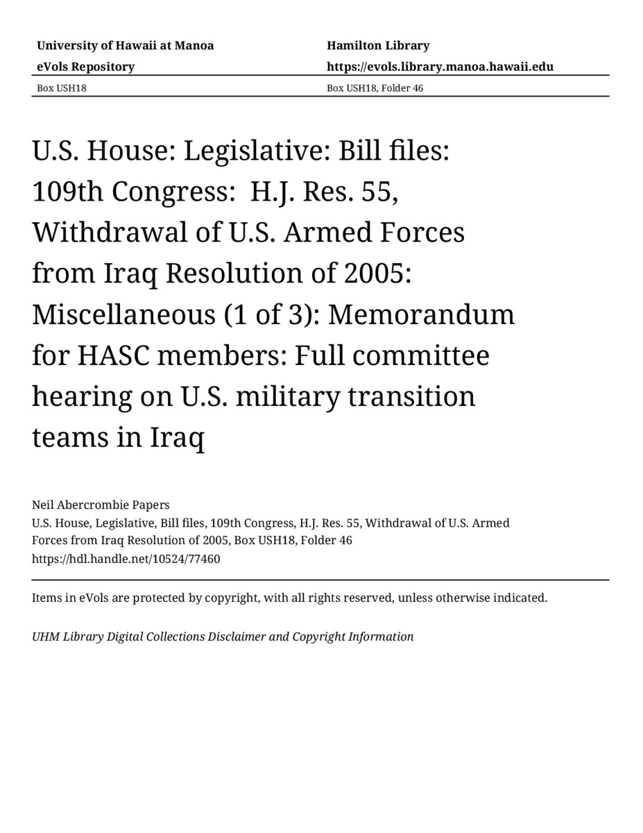 Memorandum for HASC members: Full committee hearing on U.S. military transition teams in Iraq, December 6, 2006, MANUSCRIPT-HCPC00009, U.S. House, Legislative, Bill files, 109th Congress, H.J. Res. 55, Withdrawal of U.S. Armed Forces from Iraq Resolution of 2005, Box USH18, Folder 46, Neil Abercrombie Papers, Hawaiʻi Congressional Papers Collection, University of Hawaiʻi at Mānoa Library, Honolulu, HI. https://omekas-congress.lib.wvu.edu/catalog/10524_77460 (accessed April 10, 2026).