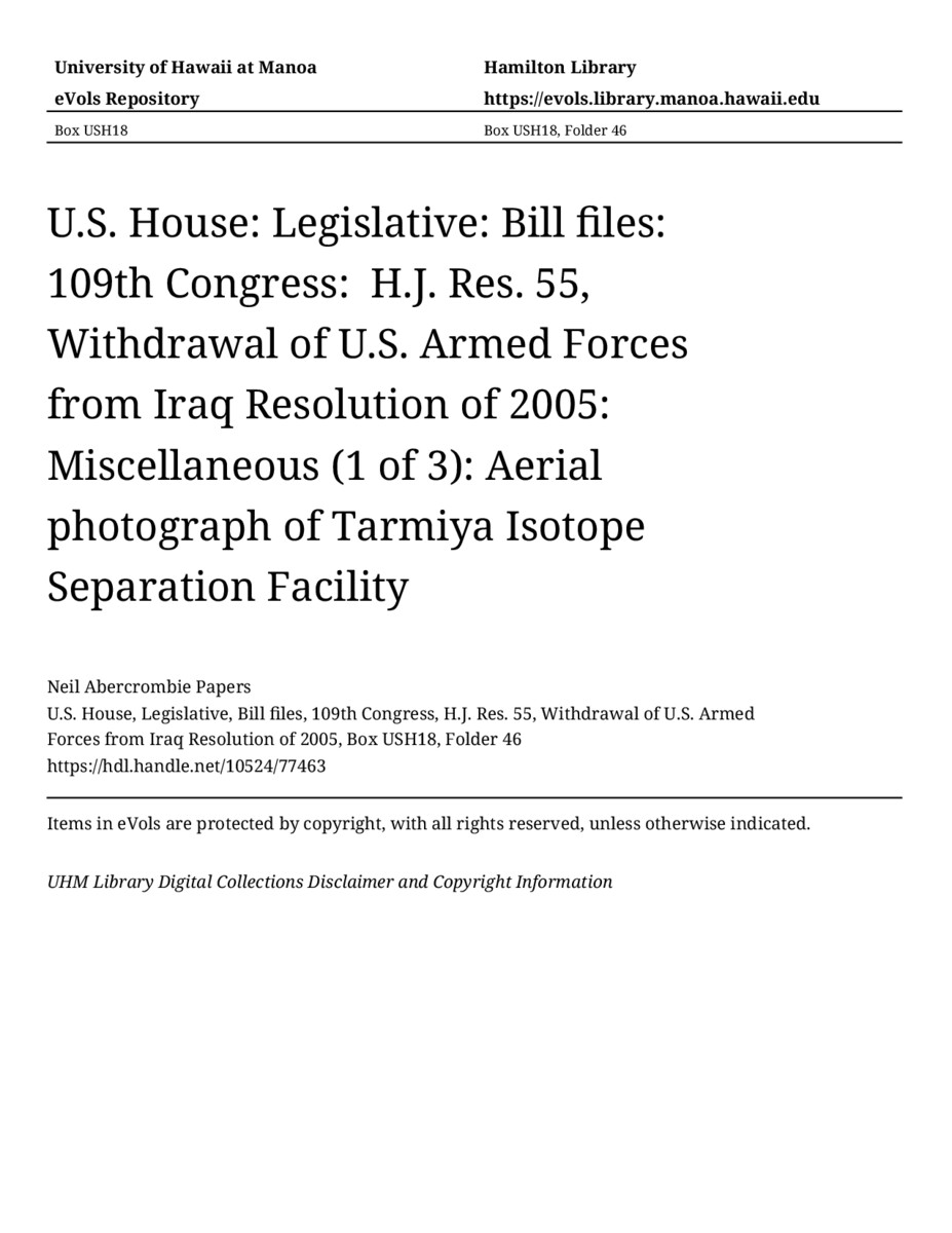 Aerial photograph of Tarmiya Isotope Separation Facility, January 22, 2002, MANUSCRIPT-HCPC00009, U.S. House, Legislative, Bill files, 109th Congress, H.J. Res. 55, Withdrawal of U.S. Armed Forces from Iraq Resolution of 2005, Box USH18, Folder 46, Neil Abercrombie Papers, Hawaiʻi Congressional Papers Collection, University of Hawaiʻi at Mānoa Library, Honolulu, HI. https://omekas-congress.lib.wvu.edu/catalog/10524_77463 (accessed April 13, 2026).