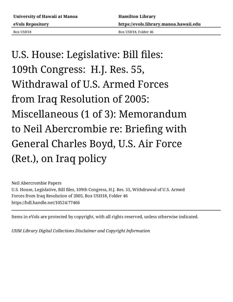 Memorandum to Neil Abercrombie re: Briefing with General Charles Boyd, U.S. Air Force (Ret.), on Iraq policy, September 19, 2002, MANUSCRIPT-HCPC00009, U.S. House, Legislative, Bill files, 109th Congress, H.J. Res. 55, Withdrawal of U.S. Armed Forces from Iraq Resolution of 2005, Box USH18, Folder 46, Neil Abercrombie Papers, Hawaiʻi Congressional Papers Collection, University of Hawaiʻi at Mānoa Library, Honolulu, HI. https://omekas-congress.lib.wvu.edu/catalog/10524_77466 (accessed April 10, 2026).