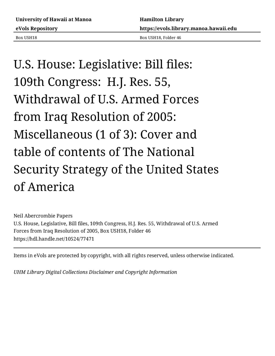 Cover and table of contents of The National Security Strategy of the United States of America, September 2002, MANUSCRIPT-HCPC00009, U.S. House, Legislative, Bill files, 109th Congress, H.J. Res. 55, Withdrawal of U.S. Armed Forces from Iraq Resolution of 2005, Box USH18, Folder 46, Neil Abercrombie Papers, Hawaiʻi Congressional Papers Collection, University of Hawaiʻi at Mānoa Library, Honolulu, HI. https://omekas-congress.lib.wvu.edu/catalog/10524_77471 (accessed April 13, 2026).