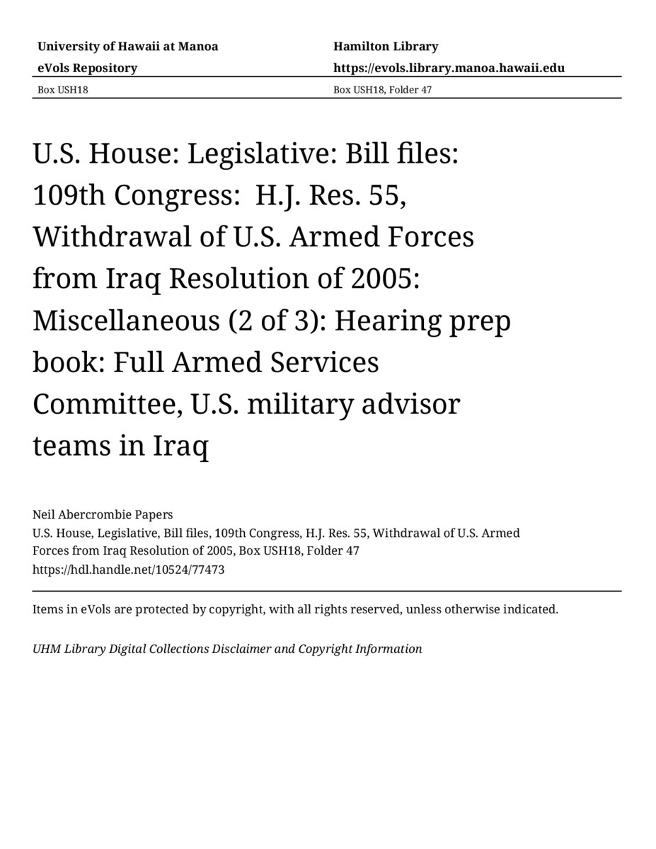 Hearing prep book: Full Armed Services Committee, U.S. military advisor teams in Iraq, December 7, 2006, MANUSCRIPT-HCPC00009, U.S. House, Legislative, Bill files, 109th Congress, H.J. Res. 55, Withdrawal of U.S. Armed Forces from Iraq Resolution of 2005, Box USH18, Folder 47, Neil Abercrombie Papers, Hawaiʻi Congressional Papers Collection, University of Hawaiʻi at Mānoa Library, Honolulu, HI. https://omekas-congress.lib.wvu.edu/catalog/10524_77473 (accessed April 10, 2026).