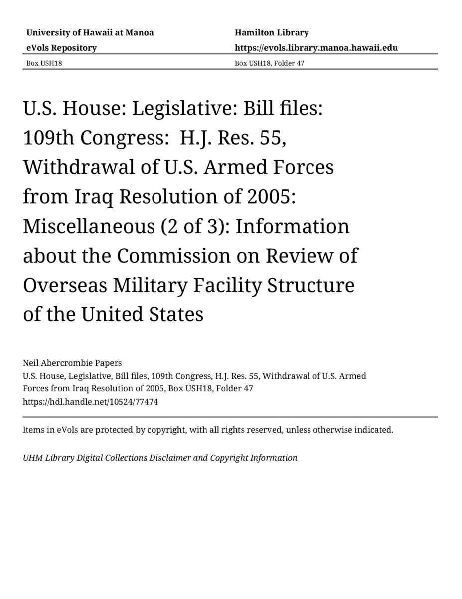 Information about the Commission on Review of Overseas Military Facility Structure of the United States, June 26, 1905, MANUSCRIPT-HCPC00009, U.S. House, Legislative, Bill files, 109th Congress, H.J. Res. 55, Withdrawal of U.S. Armed Forces from Iraq Resolution of 2005, Box USH18, Folder 47, Neil Abercrombie Papers, Hawaiʻi Congressional Papers Collection, University of Hawaiʻi at Mānoa Library, Honolulu, HI. https://omekas-congress.lib.wvu.edu/catalog/10524_77474 (accessed April 10, 2026).