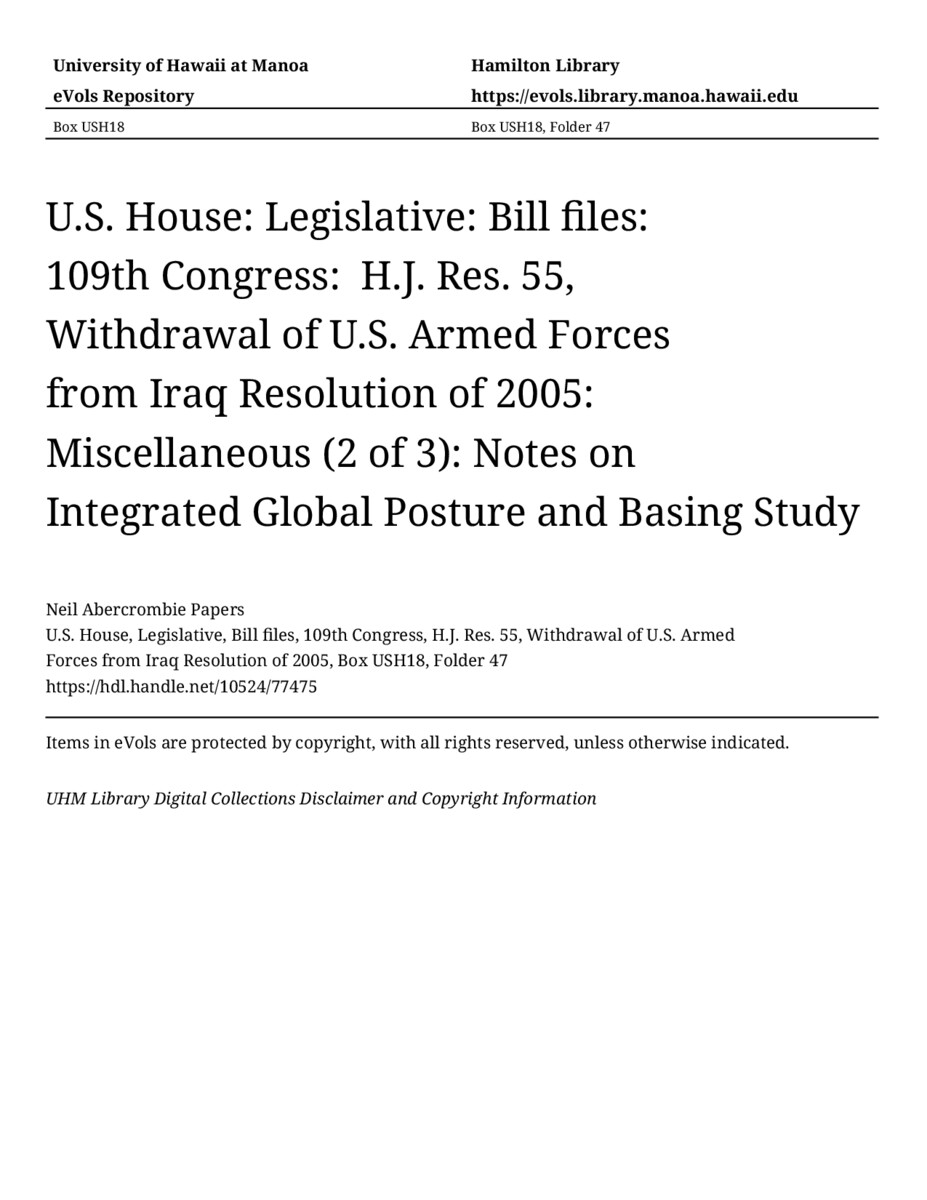 Notes on Integrated Global Posture and Basing Study, approximately 2004-2005, MANUSCRIPT-HCPC00009, U.S. House, Legislative, Bill files, 109th Congress, H.J. Res. 55, Withdrawal of U.S. Armed Forces from Iraq Resolution of 2005, Box USH18, Folder 47, Neil Abercrombie Papers, Hawaiʻi Congressional Papers Collection, University of Hawaiʻi at Mānoa Library, Honolulu, HI. https://omekas-congress.lib.wvu.edu/catalog/10524_77475 (accessed April 12, 2026).