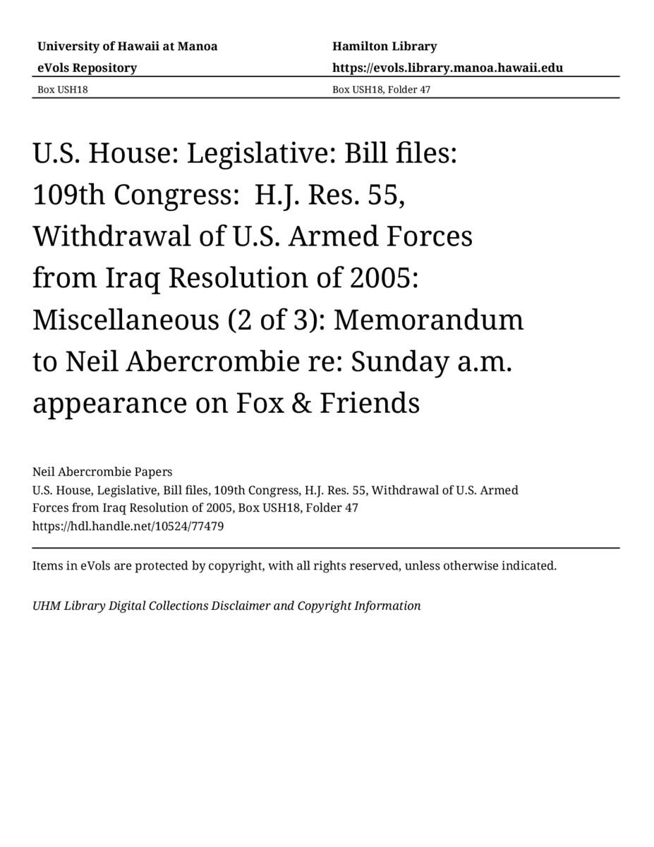 Memorandum to Neil Abercrombie re: Sunday a.m. appearance on Fox & Friends, June 17, 2005, MANUSCRIPT-HCPC00009, U.S. House, Legislative, Bill files, 109th Congress, H.J. Res. 55, Withdrawal of U.S. Armed Forces from Iraq Resolution of 2005, Box USH18, Folder 47, Neil Abercrombie Papers, Hawaiʻi Congressional Papers Collection, University of Hawaiʻi at Mānoa Library, Honolulu, HI. https://omekas-congress.lib.wvu.edu/catalog/10524_77479 (accessed April 12, 2026).