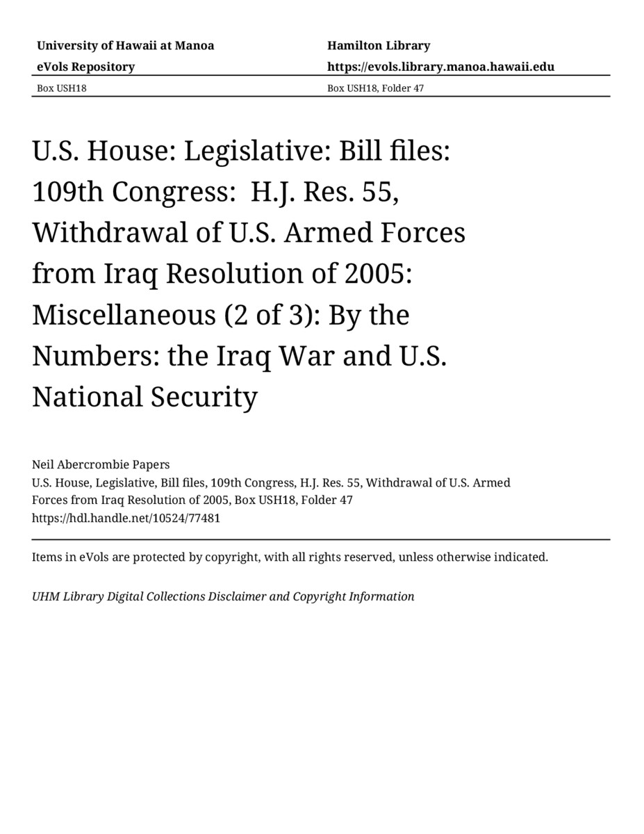 By the Numbers: the Iraq War and U.S. National Security, June 28, 1905, MANUSCRIPT-HCPC00009, U.S. House, Legislative, Bill files, 109th Congress, H.J. Res. 55, Withdrawal of U.S. Armed Forces from Iraq Resolution of 2005, Box USH18, Folder 47, Neil Abercrombie Papers, Hawaiʻi Congressional Papers Collection, University of Hawaiʻi at Mānoa Library, Honolulu, HI. https://omekas-congress.lib.wvu.edu/catalog/10524_77481 (accessed April 10, 2026).