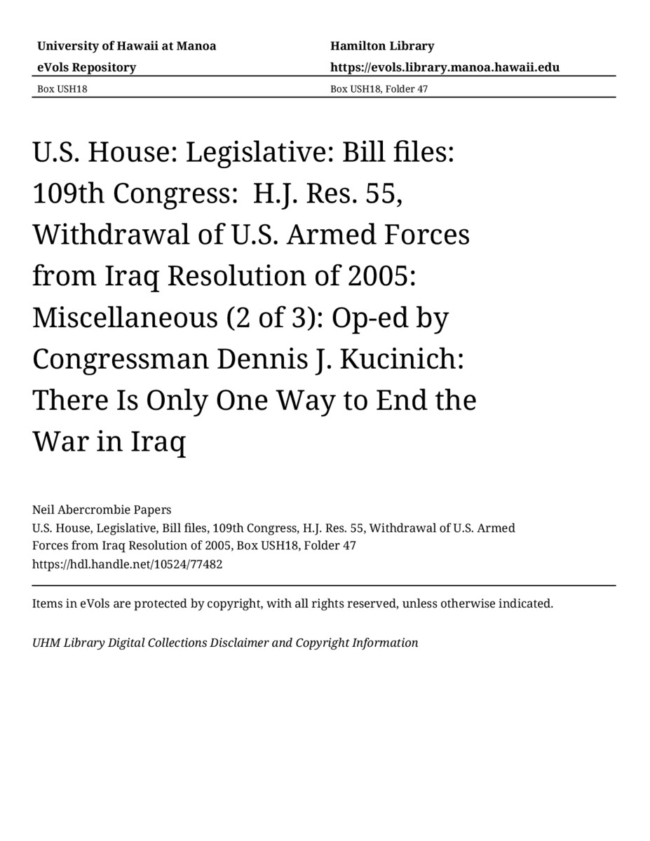 Op-ed by Congressman Dennis J. Kucinich: There Is Only One Way to End the War in Iraq, June 28, 1905, MANUSCRIPT-HCPC00009, U.S. House, Legislative, Bill files, 109th Congress, H.J. Res. 55, Withdrawal of U.S. Armed Forces from Iraq Resolution of 2005, Box USH18, Folder 47, Neil Abercrombie Papers, Hawaiʻi Congressional Papers Collection, University of Hawaiʻi at Mānoa Library, Honolulu, HI. https://omekas-congress.lib.wvu.edu/catalog/10524_77482 (accessed April 12, 2026).