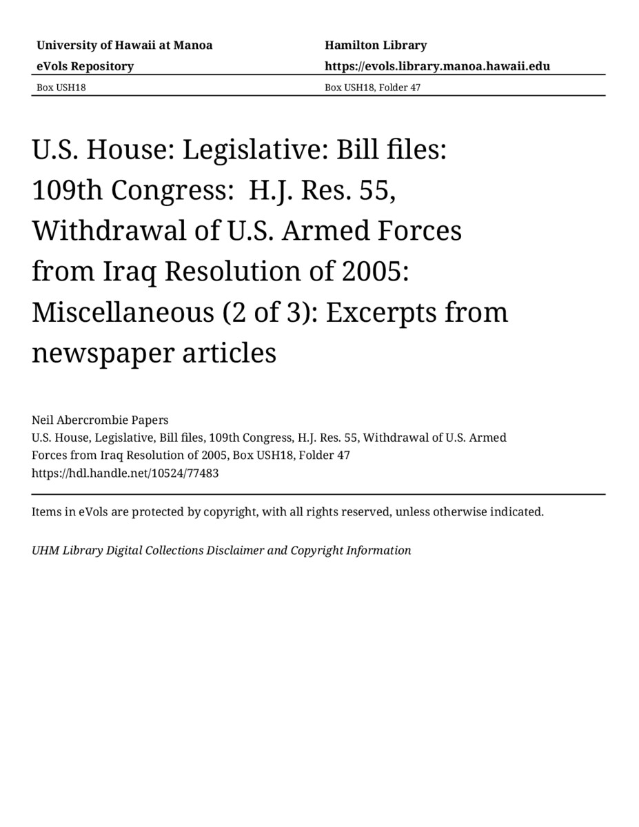 Excerpts from newspaper articles, approximately 2006-2007, MANUSCRIPT-HCPC00009, U.S. House, Legislative, Bill files, 109th Congress, H.J. Res. 55, Withdrawal of U.S. Armed Forces from Iraq Resolution of 2005, Box USH18, Folder 47, Neil Abercrombie Papers, Hawaiʻi Congressional Papers Collection, University of Hawaiʻi at Mānoa Library, Honolulu, HI. https://omekas-congress.lib.wvu.edu/catalog/10524_77483 (accessed April 10, 2026).