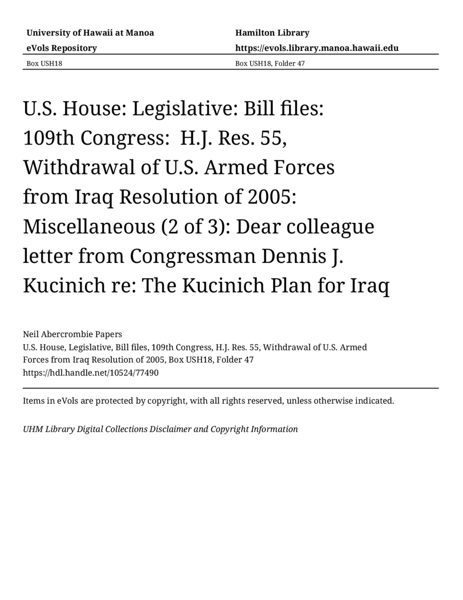 Dear colleague letter from Congressman Dennis J. Kucinich re: The Kucinich Plan for Iraq, January 10, 2007, MANUSCRIPT-HCPC00009, U.S. House, Legislative, Bill files, 109th Congress, H.J. Res. 55, Withdrawal of U.S. Armed Forces from Iraq Resolution of 2005, Box USH18, Folder 47, Neil Abercrombie Papers, Hawaiʻi Congressional Papers Collection, University of Hawaiʻi at Mānoa Library, Honolulu, HI. https://omekas-congress.lib.wvu.edu/catalog/10524_77490 (accessed April 13, 2026).