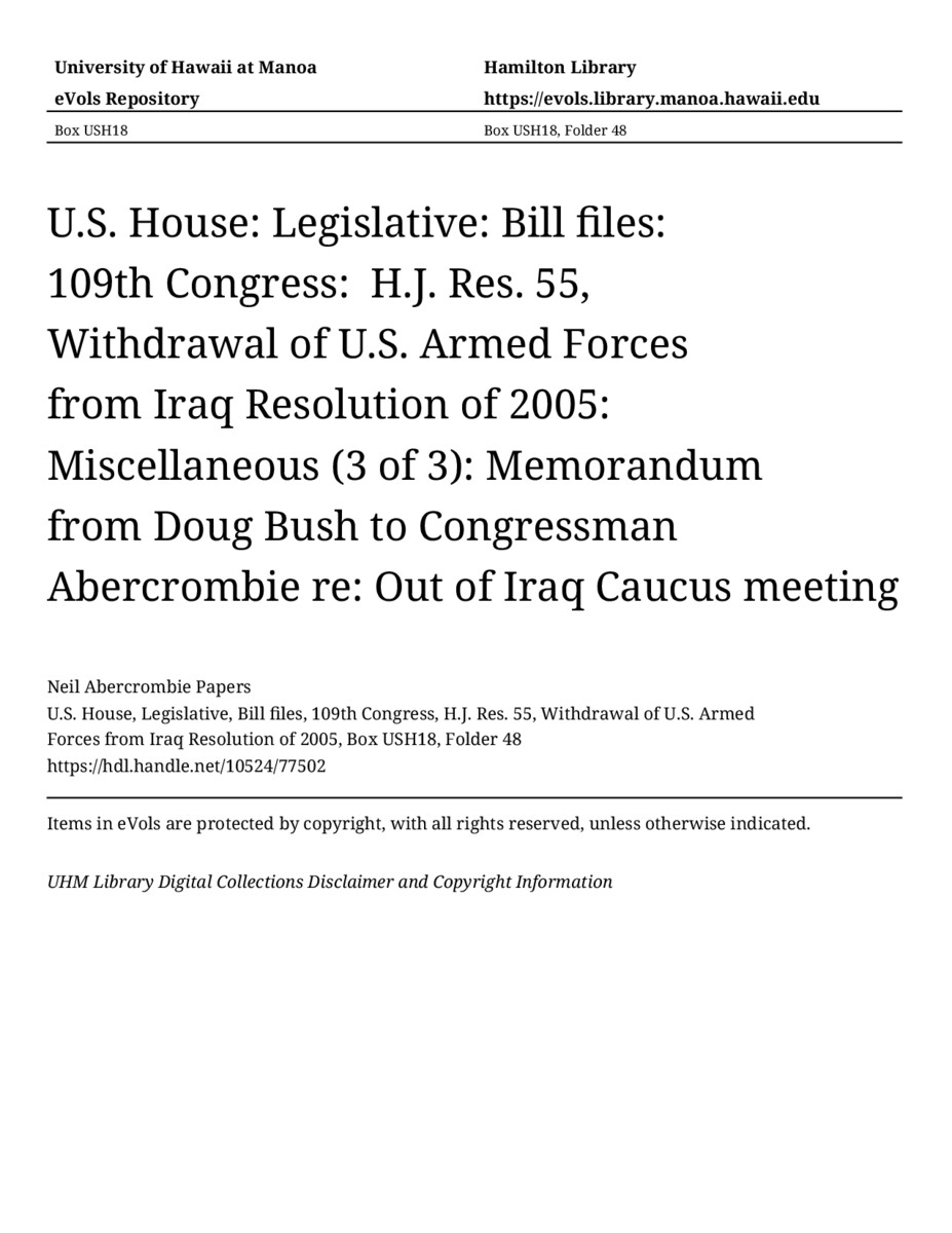 Memorandum from Doug Bush to Congressman Abercrombie re: Out of Iraq Caucus meeting, approximately 2005-2006, MANUSCRIPT-HCPC00009, U.S. House, Legislative, Bill files, 109th Congress, H.J. Res. 55, Withdrawal of U.S. Armed Forces from Iraq Resolution of 2005, Box USH18, Folder 48, Neil Abercrombie Papers, Hawaiʻi Congressional Papers Collection, University of Hawaiʻi at Mānoa Library, Honolulu, HI. https://omekas-congress.lib.wvu.edu/catalog/10524_77502 (accessed April 12, 2026).