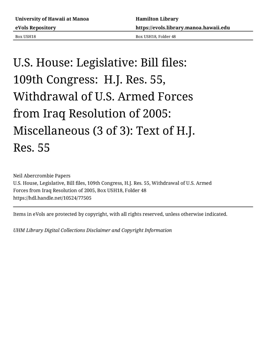 - MANUSCRIPT-HCPC00009, U.S. House, Legislative, Bill files, 109th Congress, H.J. Res. 55, Withdrawal of U.S. Armed Forces from Iraq Resolution of 2005, Box USH18, Folder 48