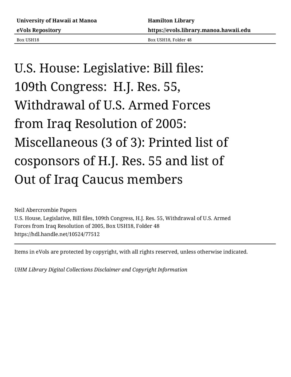 Printed list of cosponsors of H.J. Res. 55 and list of Out of Iraq Caucus members, July 20, 2005, MANUSCRIPT-HCPC00009, U.S. House, Legislative, Bill files, 109th Congress, H.J. Res. 55, Withdrawal of U.S. Armed Forces from Iraq Resolution of 2005, Box USH18, Folder 48, Neil Abercrombie Papers, Hawaiʻi Congressional Papers Collection, University of Hawaiʻi at Mānoa Library, Honolulu, HI. https://omekas-congress.lib.wvu.edu/catalog/10524_77512 (accessed April 12, 2026).