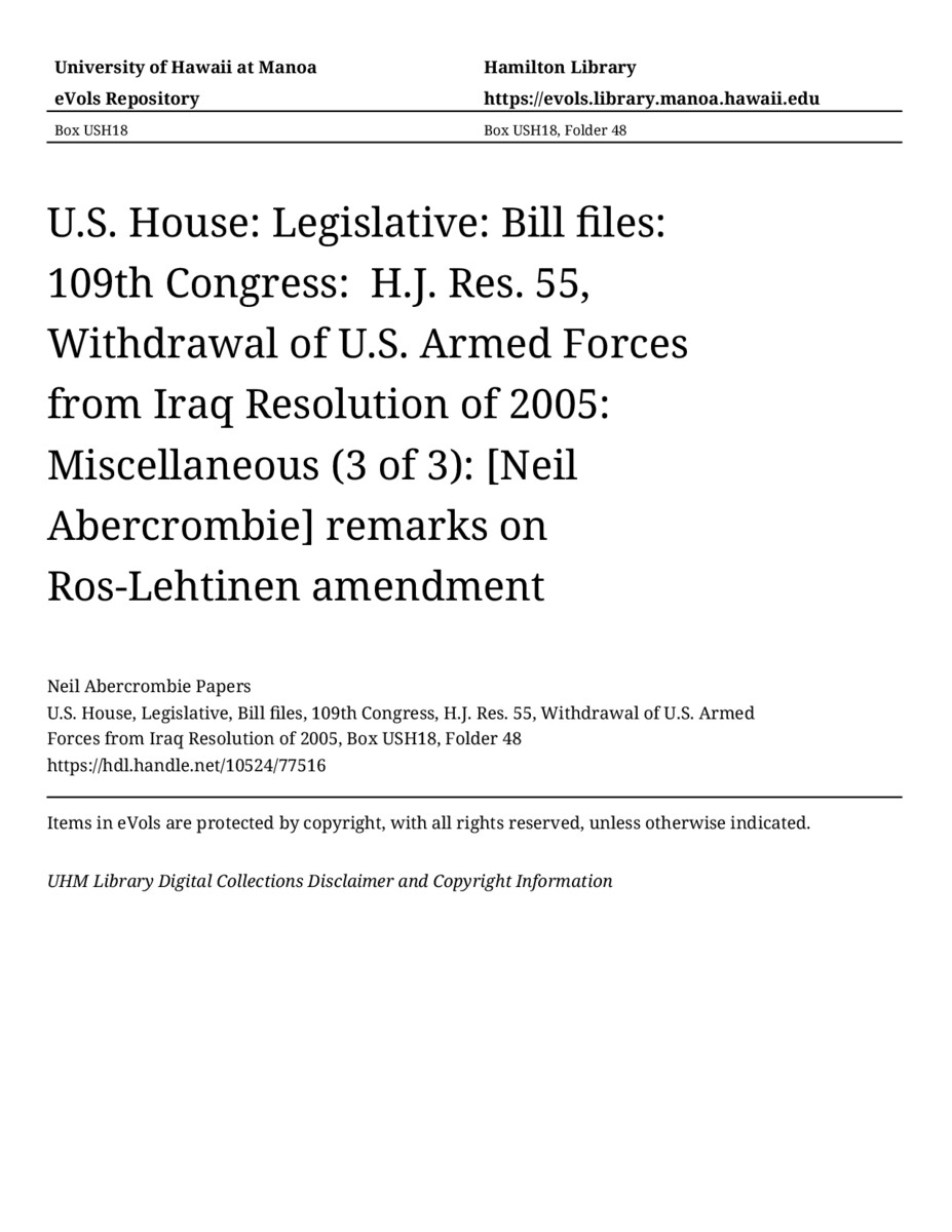 [Neil Abercrombie] remarks on Ros-Lehtinen amendment, approximately 2005-2006, MANUSCRIPT-HCPC00009, U.S. House, Legislative, Bill files, 109th Congress, H.J. Res. 55, Withdrawal of U.S. Armed Forces from Iraq Resolution of 2005, Box USH18, Folder 48, Neil Abercrombie Papers, Hawaiʻi Congressional Papers Collection, University of Hawaiʻi at Mānoa Library, Honolulu, HI. https://omekas-congress.lib.wvu.edu/catalog/10524_77516 (accessed April 10, 2026).