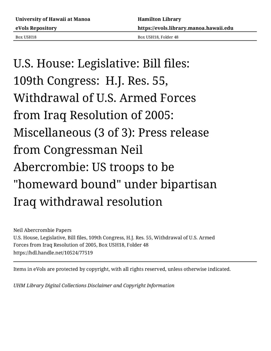 Press release from Congressman Neil Abercrombie: US troops to be "homeward bound" under bipartisan Iraq withdrawal resolution, June 16, 2005, MANUSCRIPT-HCPC00009, U.S. House, Legislative, Bill files, 109th Congress, H.J. Res. 55, Withdrawal of U.S. Armed Forces from Iraq Resolution of 2005, Box USH18, Folder 48, Neil Abercrombie Papers, Hawaiʻi Congressional Papers Collection, University of Hawaiʻi at Mānoa Library, Honolulu, HI. https://omekas-congress.lib.wvu.edu/catalog/10524_77519 (accessed April 12, 2026).