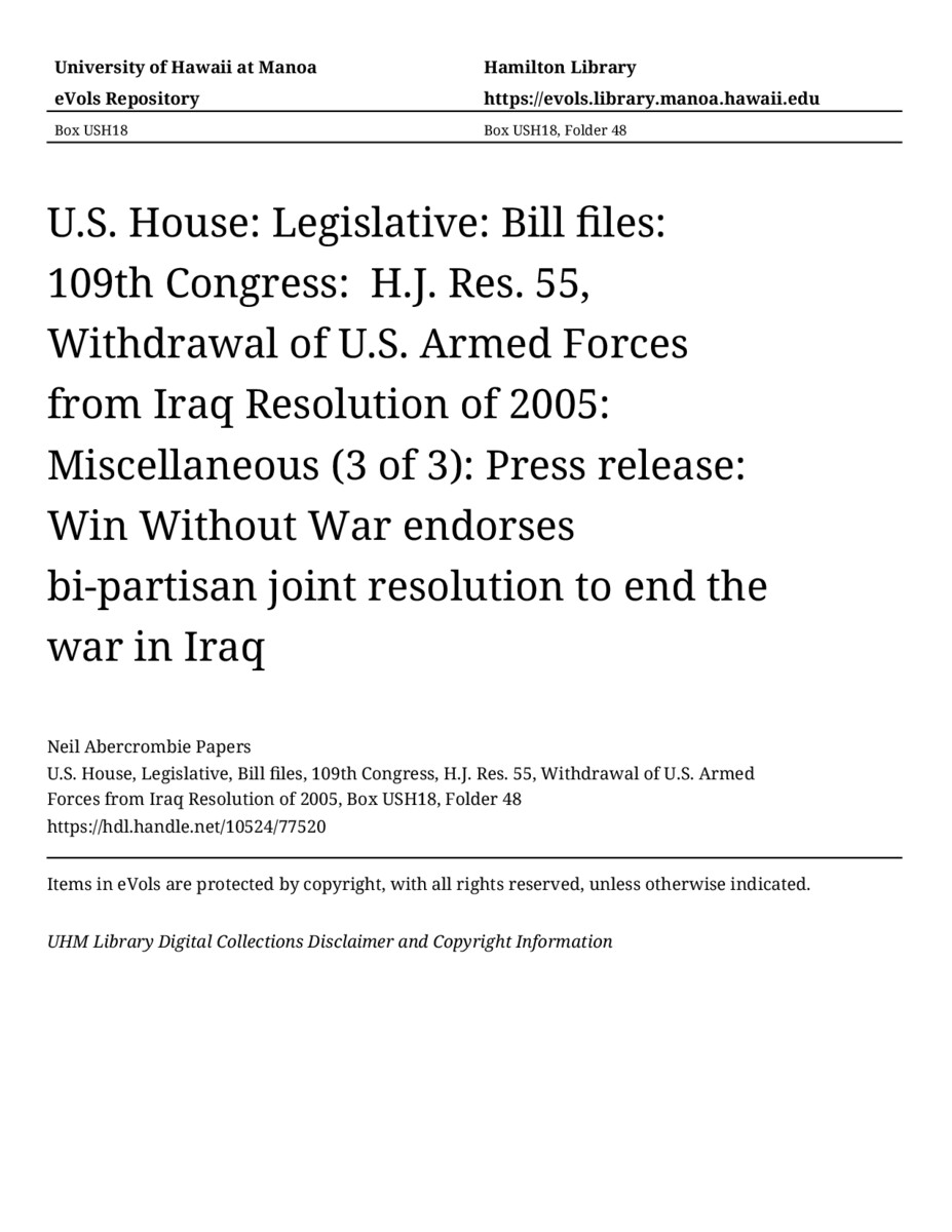 Press release: Win Without War endorses bi-partisan joint resolution to end the war in Iraq, June 15, 2005, MANUSCRIPT-HCPC00009, U.S. House, Legislative, Bill files, 109th Congress, H.J. Res. 55, Withdrawal of U.S. Armed Forces from Iraq Resolution of 2005, Box USH18, Folder 48, Neil Abercrombie Papers, Hawaiʻi Congressional Papers Collection, University of Hawaiʻi at Mānoa Library, Honolulu, HI. https://omekas-congress.lib.wvu.edu/catalog/10524_77520 (accessed April 10, 2026).