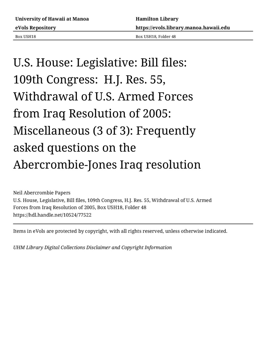 Frequently asked questions on the Abercrombie-Jones Iraq resolution, approximately 2005-2006, MANUSCRIPT-HCPC00009, U.S. House, Legislative, Bill files, 109th Congress, H.J. Res. 55, Withdrawal of U.S. Armed Forces from Iraq Resolution of 2005, Box USH18, Folder 48, Neil Abercrombie Papers, Hawaiʻi Congressional Papers Collection, University of Hawaiʻi at Mānoa Library, Honolulu, HI. https://omekas-congress.lib.wvu.edu/catalog/10524_77522 (accessed April 10, 2026).