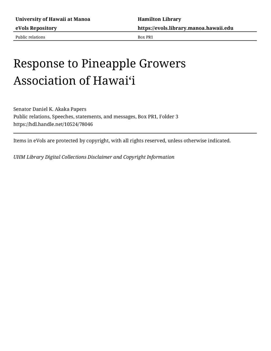 Response to Pineapple Growers Association of Hawaiʻi, January 26, 1977, MANUSCRIPT-HCPC00010, Public relations, Speeches, statements, and messages, Box PR1, Folder 3, Senator Daniel K. Akaka Papers, Hawaiʻi Congressional Papers Collection, University of Hawaiʻi at Mānoa Library, Honolulu, HI. https://omekas-congress.lib.wvu.edu/catalog/10524_78046 (accessed April 13, 2026).