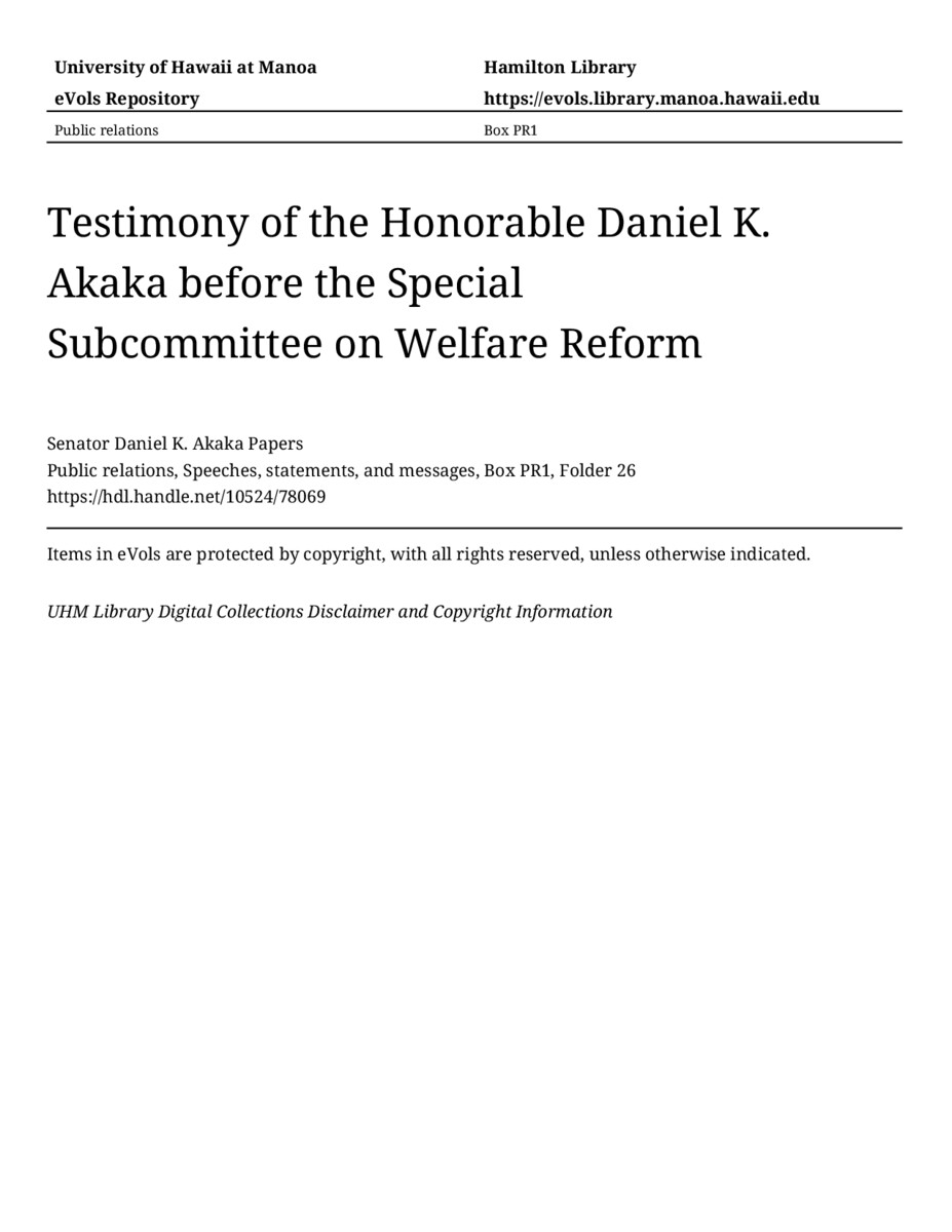 - Testimony of the Honorable Daniel K. Akaka before the Special Subcommittee on Welfare Reform
