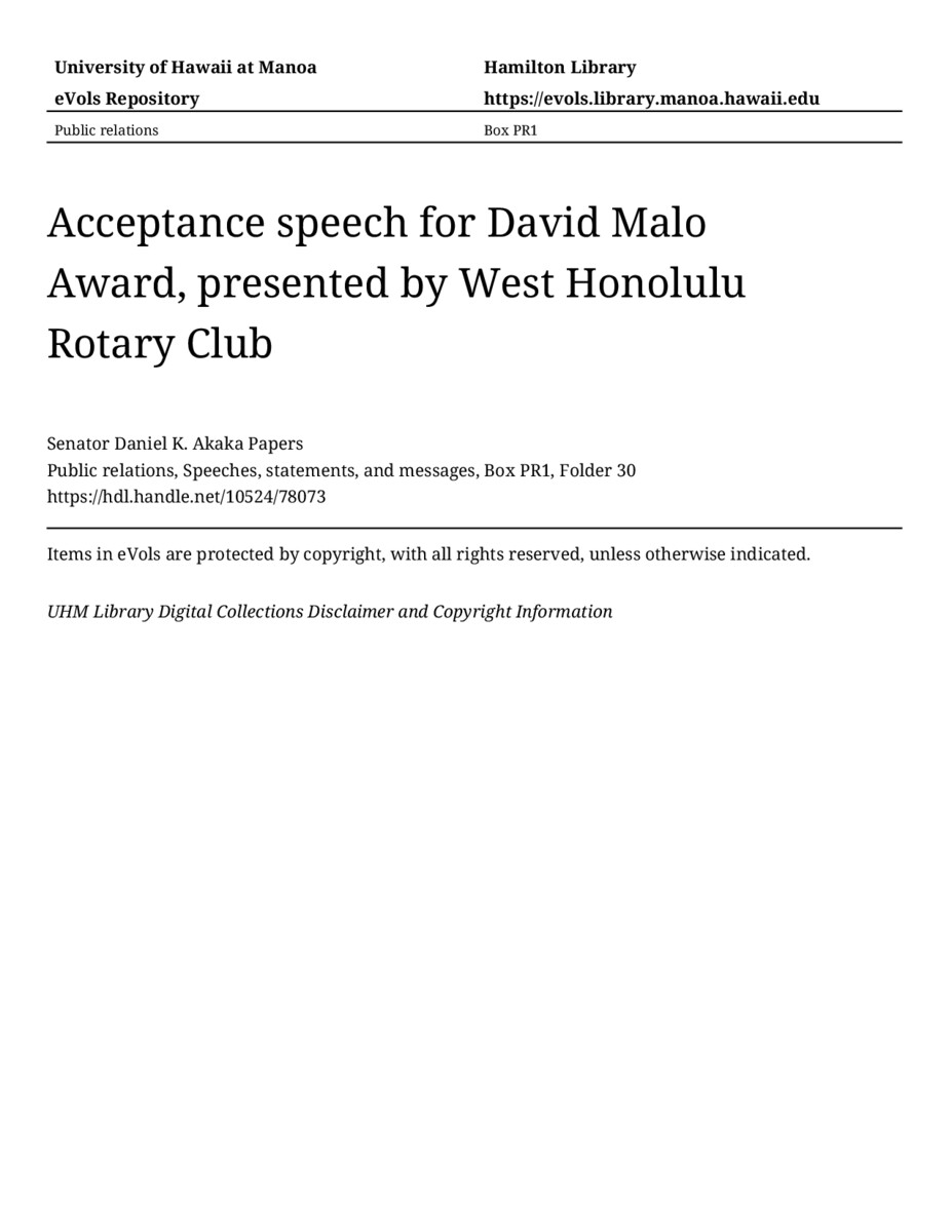 - Acceptance speech for David Malo Award, presented by West Honolulu Rotary Club