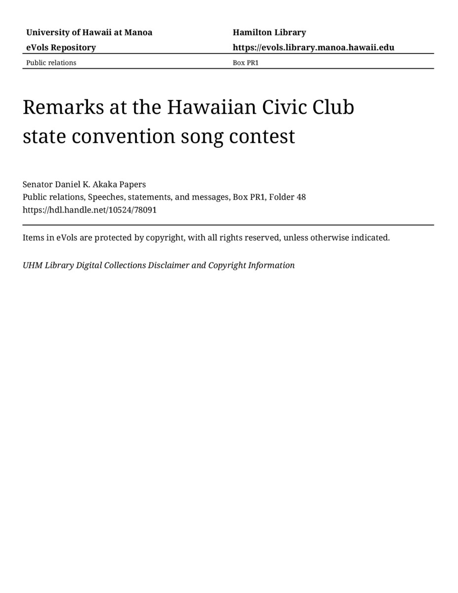 - Remarks at the Hawaiian Civic Club state convention song contest
