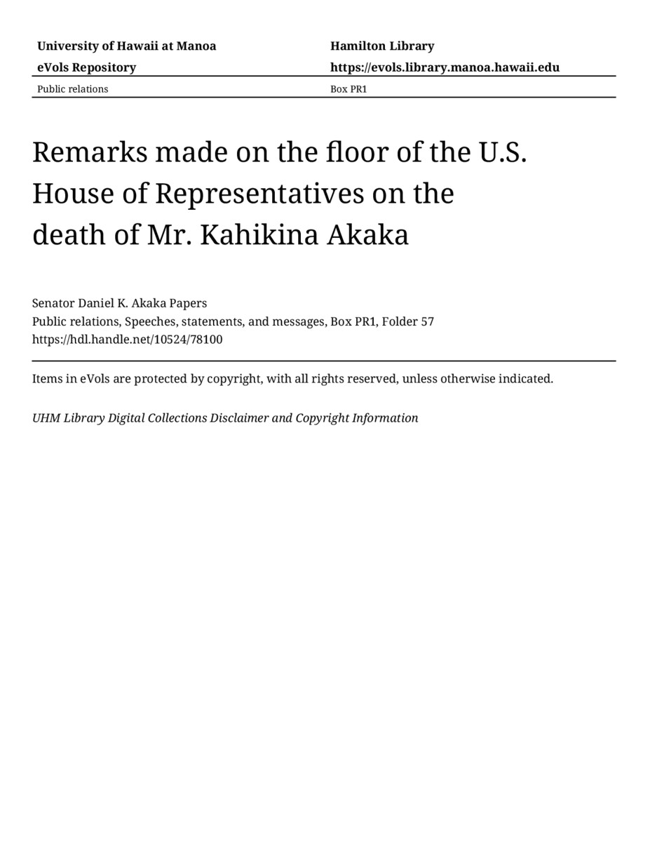 - Remarks made on the floor of the U.S. House of Representatives on the death of Mr. Kahikina Akaka