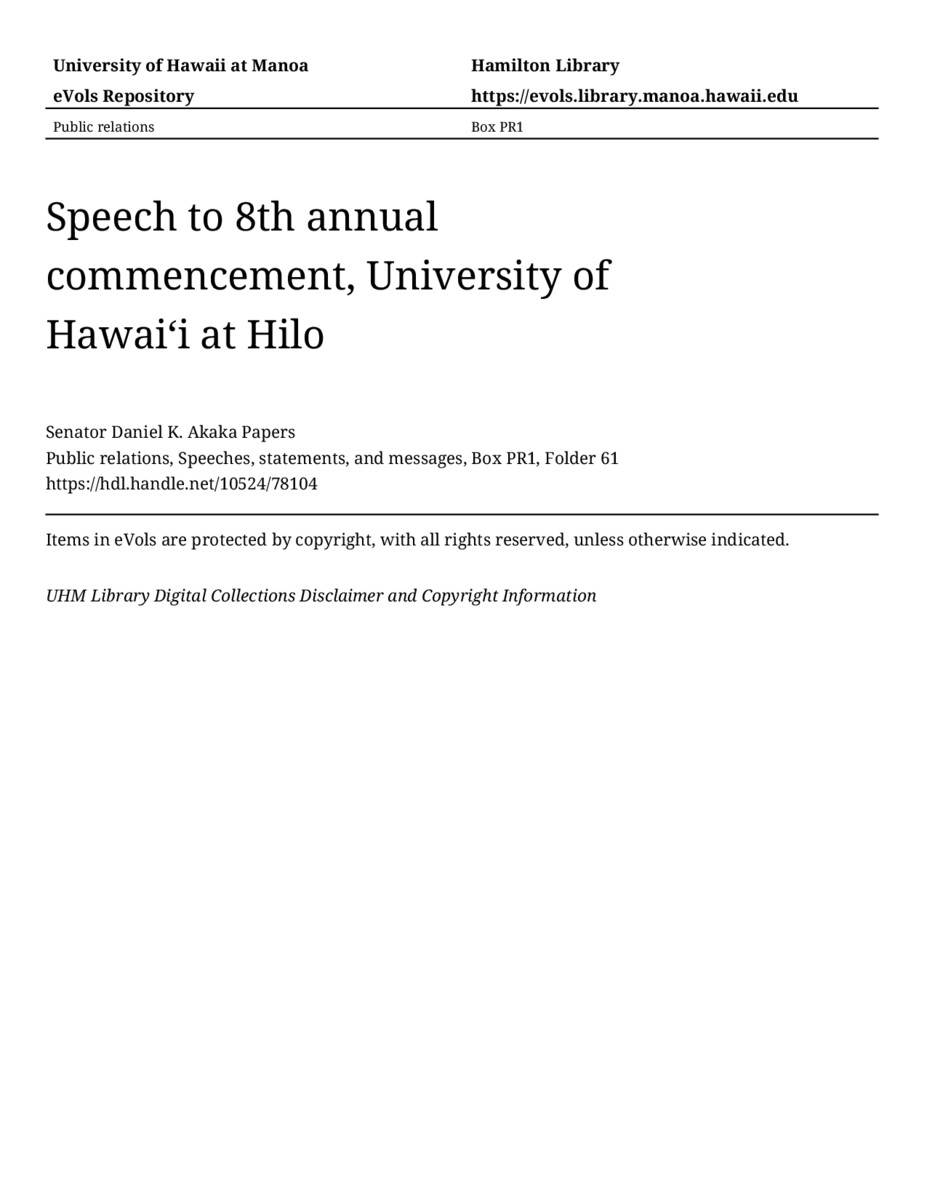 - Speech to 8th annual commencement, University of Hawaiʻi at Hilo