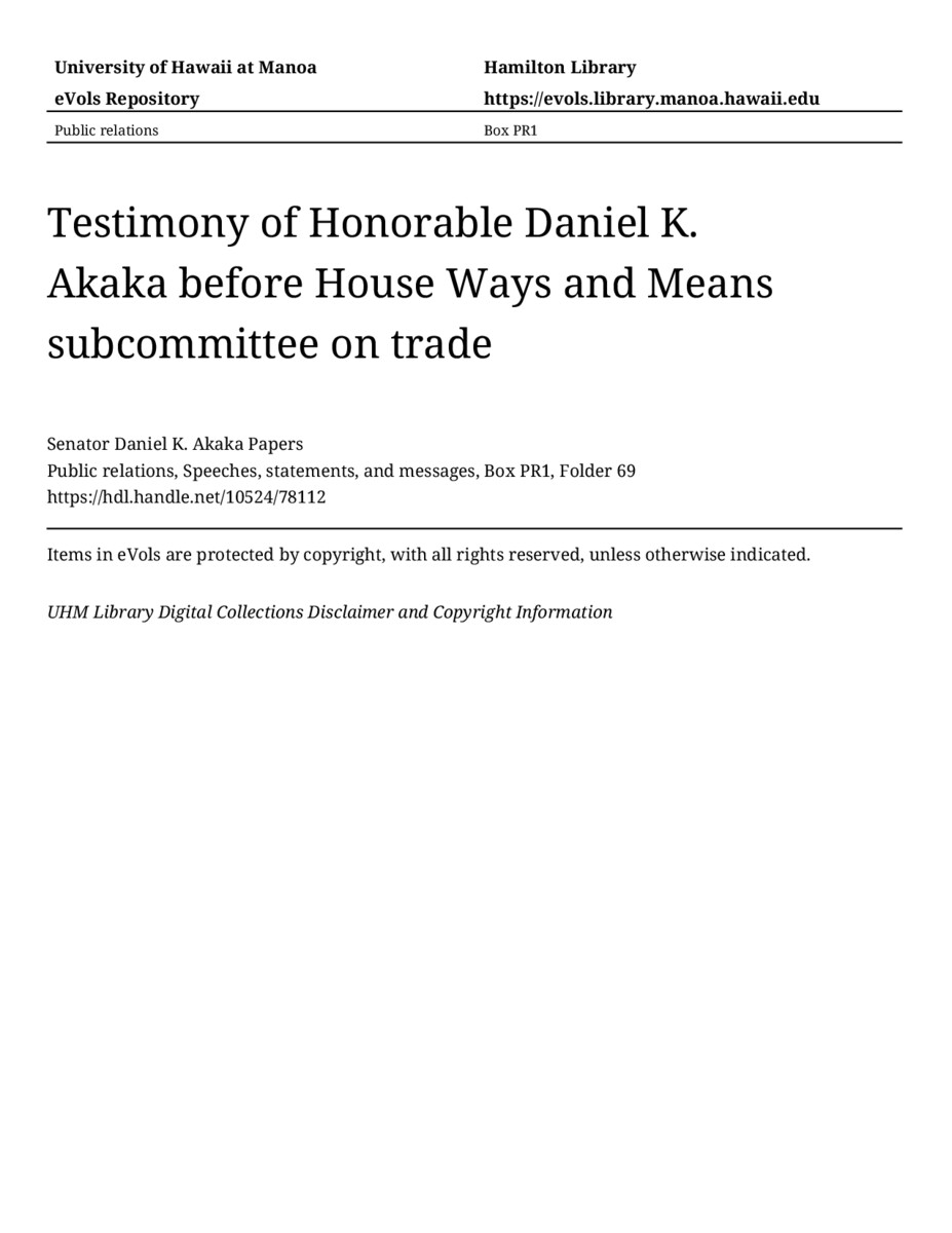 - Testimony of Honorable Daniel K. Akaka before House Ways and Means subcommittee on trade
